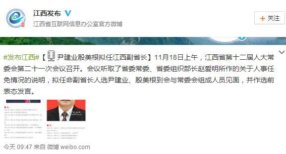 人民网北京11月18日电 据江西省互联网信息办公室官方微博消息,11月18日上午,江西省第十二届人大常委会第二十一次会议召开。会议听取了省委常委、省委组织部长赵爱明所作的关于人事任免情况的说明,拟任命副省长人选尹建业、殷美根到会与常委会组成人员见面,并作选前表态发言。