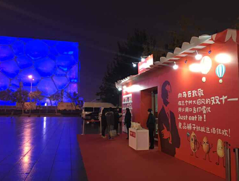 首先在水立方天猫晚会的现场,良品铺子率先发现了一些透明的玻璃屋,这些玻璃屋此前很少参与到营销当中,而其他商家,甚至天猫也没有注意。等良品铺子抢先拿到这些去晚会必经之路的资源之后,很多商家也才反应过来。这6家玻璃屋被打扮为良品铺子线下店,红色的颜色十分醒目,加上派发免费零食,从而引来众多去看晚会的观众关注、领取。一边吃着良品铺子的零食一边去晚会,成为一景。