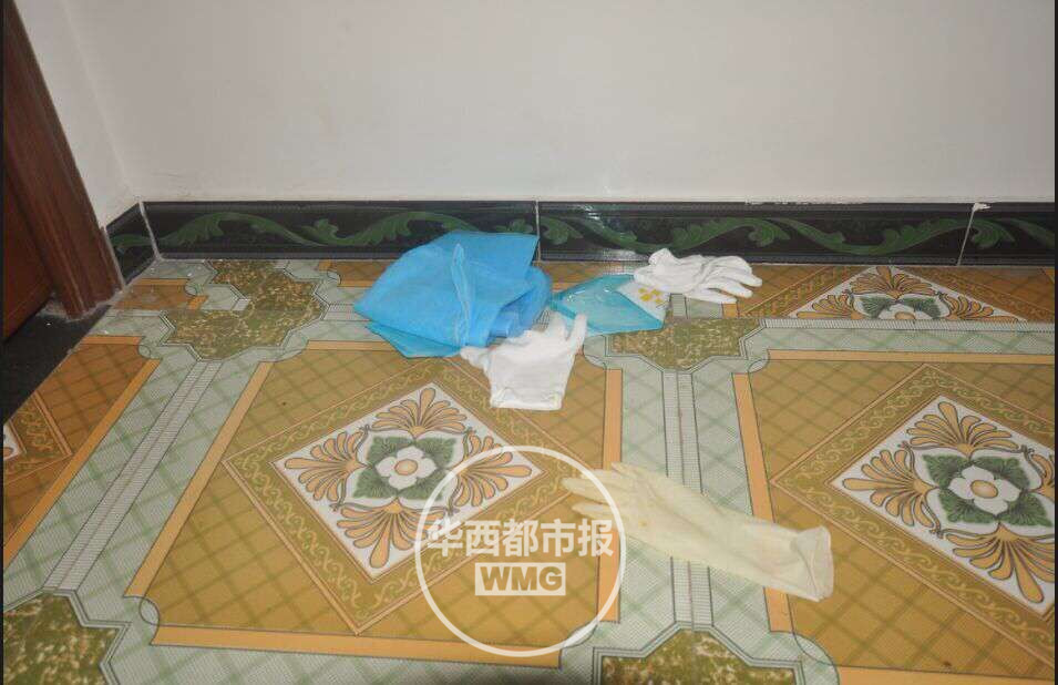 院坝内一片狼藉,紧挨大门的地方有一条断了的绳子,旁边是一根皮带和一只男式鞋子,附近还有许多使用过的白手套、蓝色塑料袋和一些食品垃圾袋、矿泉水瓶等杂物。顺着房屋大门,记者走进了房屋。房屋主人小熊(化名)介绍,原本客厅内什么也没有,现在却多了一张铁床和一根铁制烟囱,客厅地上随处可见烟头,一地凌乱。
