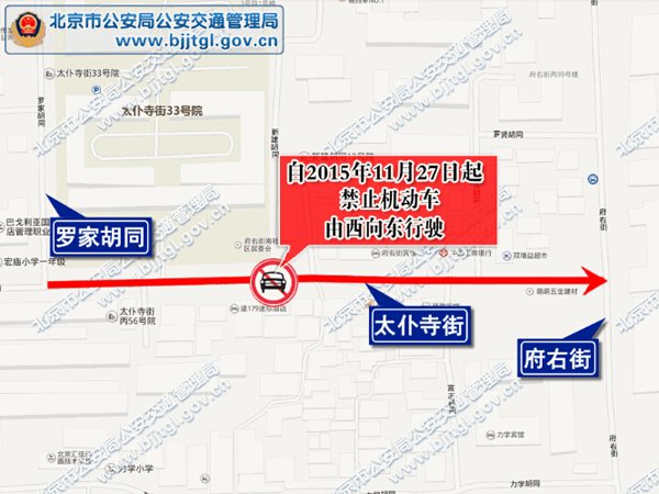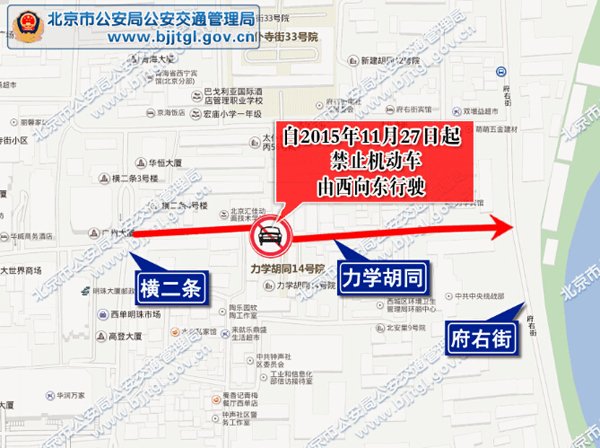 4.力学胡同(府右街至横二条)禁止机动车由西向东行驶;
