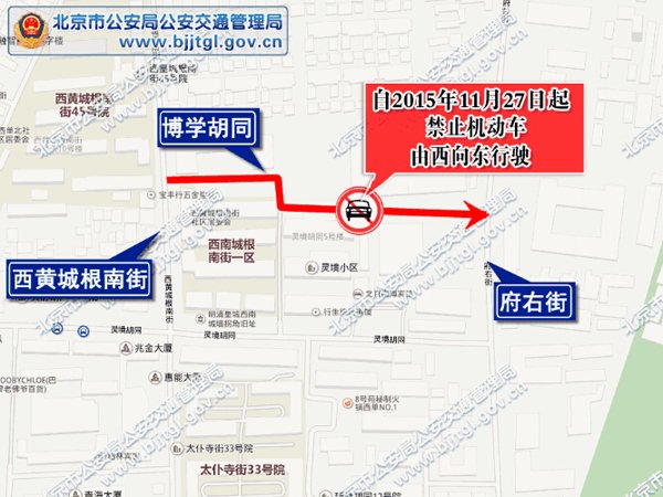 2.博学胡同(府右街至西黄城根南街)禁止机动车由西向东行驶;
