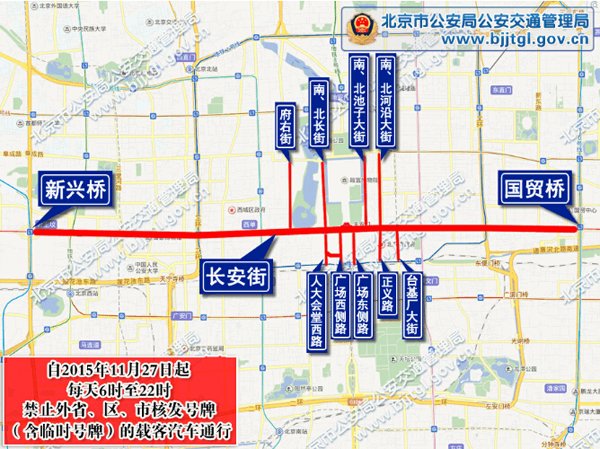 京事儿(微信号:xjb-jingshier) 今天下午从北京市公安交管局得到消息,从11月27日起,外地车每天6时到22时禁止在二环路(主路)行驶,此外,长安街以及延线国贸桥到新兴桥之间路段,以及天安门周边路段,每天6时至22时也禁止外地车通行。