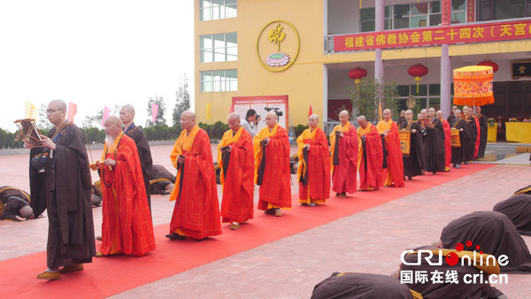 国际在线报道(记者 台林珍):“有福方登圣贤地,无缘难入涅槃门”,沿着直达圆通寺的灵鹫岭石阶古道,登山朝圣,犹如从尘世通往梵天仙境。闽西著名的佛教圣地天宫山圆通寺已有一千三百多年的历史。11月20日,圆通寺庄严肃静,钟鼓梵音,迎来了隆重的传授比丘戒法会,礼请中国佛教协会会长、福建佛教协会会长学诚大和尚为得戒和尚,按照汉传佛教三坛大戒仪轨向前来求戒的300余名戒子规范传授佛陀比丘戒法,隆重的仪式见证着一介凡夫趣向圣者的历程。学诚大和尚期冀新戒比丘做有责任的出家人,肩负历史赋予的使命。
