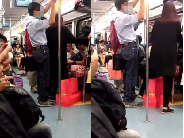 起初这名女子似乎没有察觉,但这名口罩男似乎不断地紧贴着对方,甚至还有些动作,但明明旁边空间还很大,男子偏偏站在女子身后,让人感觉有些奇怪。事后女子似乎察觉到了,要转身时发现后面站着一名男子,脚也差点踩到对方,她最后索性转身,绕到口罩男的背后走去,而口罩男似乎毫无所动。