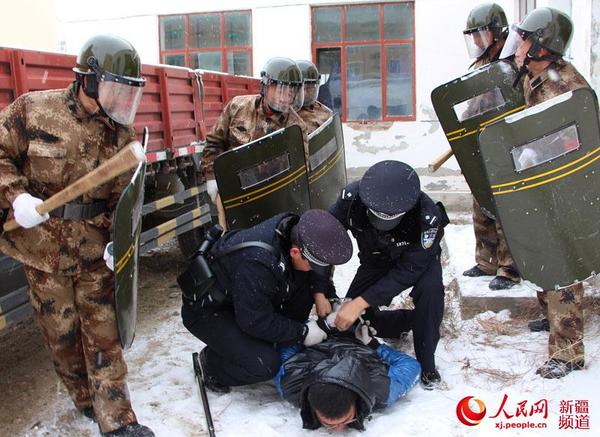 这是11月24日,新疆生产建设兵团第十师一八七团举行维稳应急处突演练活动,警民联动,成功制服三名“暴恐分子”,有力震慑了暴恐犯罪的场景。