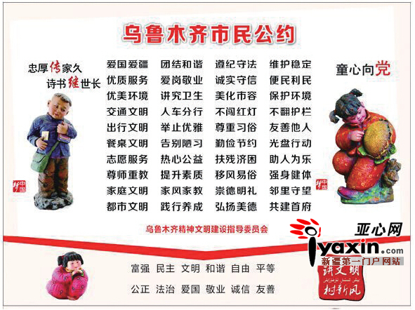 亚心网记者从乌鲁木齐市精神文明建设指导委员会获悉,近期会在首府各公共场所张贴公约,越来越多的市民都会看见。下一步,乌鲁木齐市将组织各种宣传展示和教育实践活动,引领和带动全市市民共做文明人。