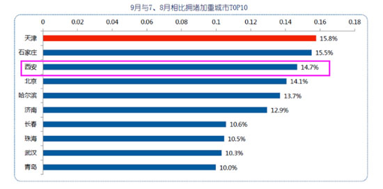 陕西是教育大省,据统计,截至2010年底,西安市共有义务教育学校1786所,在校学生82.14万人。受9月开学季的明显影响,相比7、8月,9月份西安城市拥堵延时指数飙升至14.7%,位列拥堵加剧TOP5城市的第三名。