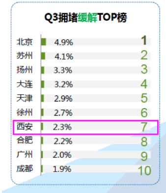 值得注意的是,西安三季度缓堵成效明显。环比二季度,拥堵程度缓解2.3%,位居三季度全国缓堵TOP榜第7位。