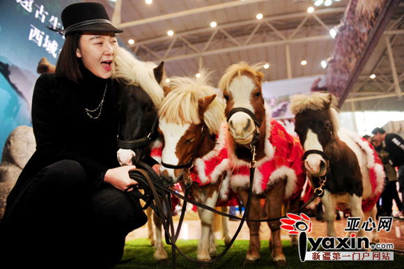 此次来展会卖萌的共有4匹迷你马,均是野马国际带来参展的。据野马国际马术俱乐部经理郝好介绍,公司从美国进口了6匹美国迷你马,每匹价格在10-15万元不等,此次带来参展的4匹迷你马,早上8时许就吃完早餐,然后穿上俱乐部转门为其定制的彩衣,乘坐专车来到新疆国际会展中心,在这里他们成为展会上卖萌的明星,一些小孩子还爬上马背骑乘,而迷你马表现也很温顺,没有任何反抗。
