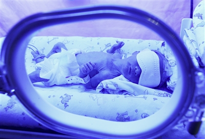 昨日,北碚,市九院,产妇龙资梅(左一)和三胞胎中的老大、老二在一起。老三(小图)体质太弱,还呆在育婴箱。本报记者 杨新宇 摄