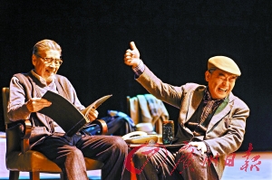 11月的广州,没降温前观众还穿着夏装,而蓝天野则穿着剧中要求的冬装——一件老式灰棉袄,戴着格子围巾。我坐在台下吹着空调,尚且不觉得凉快,他在台上却要不间断演足105分钟……我可以想象他的大汗淋漓。
