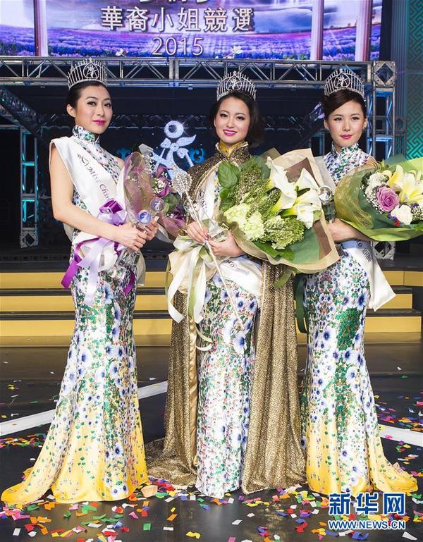 11月27日,在加拿大多伦多,获得多伦多华裔小姐选美决赛冠军的柯思懿(中)与亚军钱枫然(右)、季军郭津含在颁奖仪式上合影。在当日落幕的2015年加拿大多伦多华裔小姐选美决赛中,出生于中国的23岁选手柯思懿夺得冠军。 新华社发(邹峥摄)