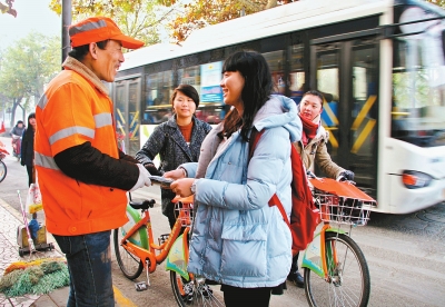 昨日上午8时30分,7名同学骑着公共自行车,从南门出发,沿着环城路开始为保洁员送棉手套和口罩。看到沿路的保洁员,同学们马上将自行车停在路边,从背包里取出手套和口罩送到保洁员手中。保洁员樊大姐感动地说:“去年冬天,大学生们就给咱保洁员送手套,这次不仅送来手套还送来口罩,谢谢同学们。”大学生们骑着自行车,从环城南路、环城东路、环城北路、环城西路再回到环城南路上,为保洁员送棉手套和口罩。 记者黄亚平摄$$$$$$$$qualitylevel=C