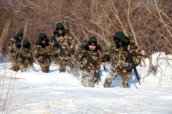 黑龙江佳木斯边防支队官兵冒着零下30摄氏度的严寒在没膝积雪中巡护黑瞎子岛。闫忠诚/摄