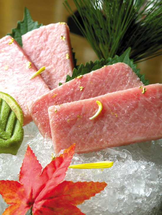 以蓝鳍吞拿鱼或黄鳍吞拿鱼的腹部制成的鱼生寿司,被日式老饕们视作人间珍味。据说,这种“吞拿鱼腩”口感绵密腴滑,沾舌即化,比起西洋料理的带血牛肉毫不逊色。