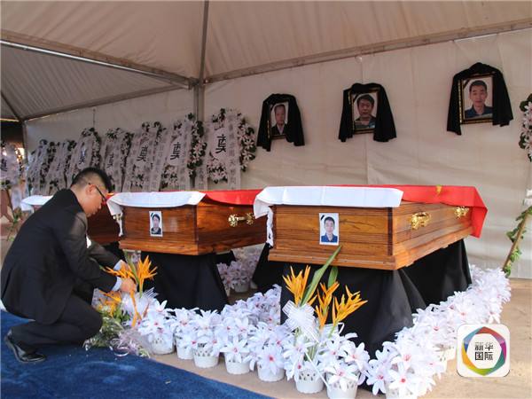 图为11月25日,在马里首都巴马科举行的中铁建遇难同胞遗体告别仪式现场,一名工作人员在布置鲜花。(新华社记者王猛摄)
