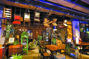 在广州,隐于家私店林立的维家思广场中,“杂咖”完美地“伪装”起家私店的身份。店里的家私都是欧式风格,微微泛黄的灯光洒在家私上,植物盆栽被精致地点缀在家私中间,很是有古典欧式时光沉淀的独特韵味。