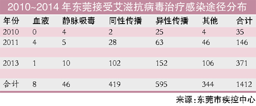 东莞市疾控中心对2010年至2014年在东莞接受艾滋病抗病毒治疗的1412个病例也进行了跟踪分析,结果显示,这1412人中80.17%为男性,已婚或同居者占55.88%。经异性和同性传播比例5年平均分别为42.14%和29.67%。