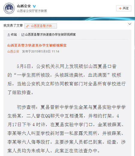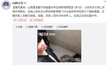 经小编检索,“逼吃屎”视频实际为今年5月发生在山西省夏县的暴力事件,5月8日,山西省公安厅官方微博发布了事件通报声明。当事人为山西夏县晋新中学学生金某,打人者为山西夏县实验中学学生薛某、李某等六人。