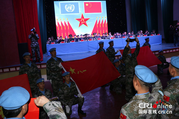 中国第二批赴南苏丹(朱巴)维和步兵营营长王玉安带领维和官兵向国旗、军旗宣誓(摄影:李光辉)