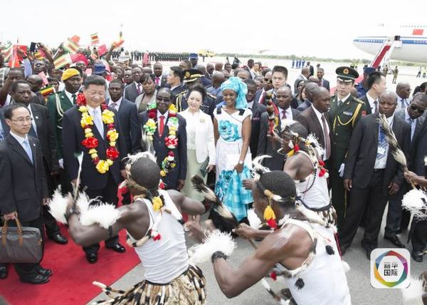 上午10时15分左右,专机降落,习主席和夫人彭丽媛走下旋梯。奏中津两国国歌,鸣21响礼炮,检阅仪仗队,当地儿童献花环和鲜花……前来迎接的津巴布韦总统穆加贝,为习主席举行了隆重的欢迎仪式。