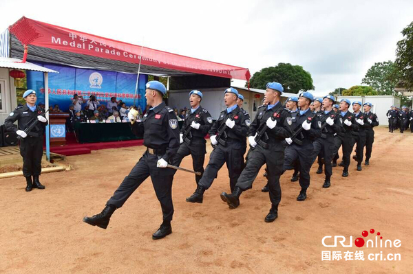 12月1日,利比里亚锡诺州格林维尔市中国防暴队营地,中国第三支赴利比里亚维和警察防暴队在授勋仪式上进行分列式展示。摄影由永怀