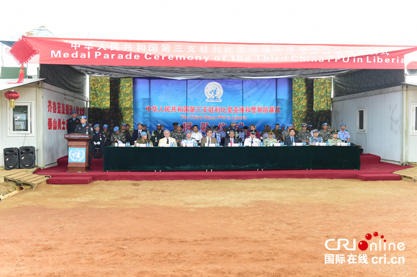 国际在线报道(记者李晋、由永怀):利比里亚时间12月1日,联合国驻利比里亚特派团(简称联利团)向中国第三支赴利比里亚维和警察防暴队全体140名队员授予了“和平勋章”,以表彰他们在维和行动中的突出贡献。联利团最高官员、联合国秘书长特别代表法里德·扎里夫、副特别代表奥德玛·瓦里、警察总监格雷格·辛茨等官员为中国防暴队授勋。