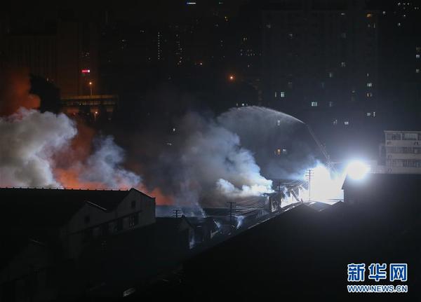 12月2日晚21时15分许,上海杨浦区纪念路附近一粮油市场发生大火。公安消防接报后随即赶赴现场展开处置,现场过火面积较大。记者从警方获悉,目前杨浦纪念路大火已被扑灭,无人员伤亡报告。图为火灾现场(航拍照片)。 新华社发(沈春琛摄)