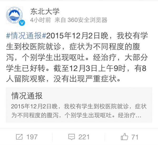 12月3日,东北大学党委宣传部通过东北大学官方微博@东北大学就此事发布情况通报:2015年12月2日晚,我校有学生到校医院就诊,症状为不同程度的腹泻,个别学生出现呕吐。经治疗,大部分学生已好转。截至12月3日上午9时,有8人留院观察,没有出现严重症状。