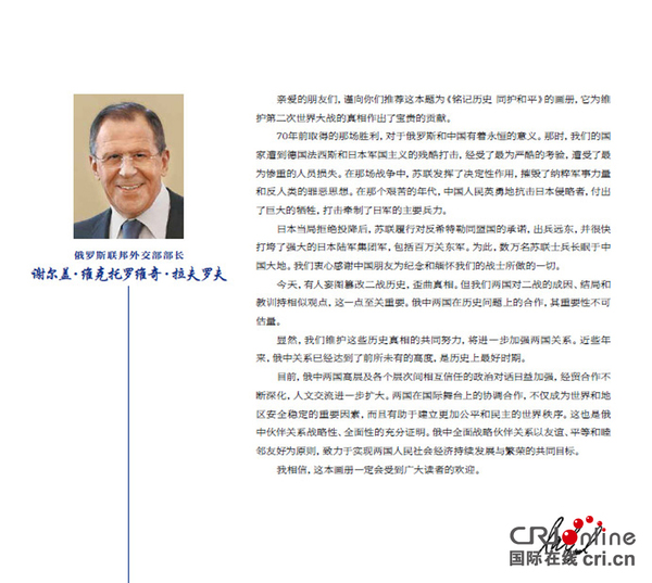 国际在线报道:在中国人民抗日战争暨世界反法西斯战争胜利70周年之际,国家主席习近平和俄罗斯总统普京日前分别为《铭记历史 同护和平——纪念世界反法西斯战争胜利70周年》画册致辞。