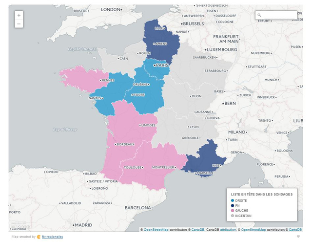 民族阵线预计将拿下深蓝色的两个选区,萨科齐的中右联盟预计拿下蓝色选区,红色选区归属奥朗德的社会党。灰色的选区目前倾向未确定。