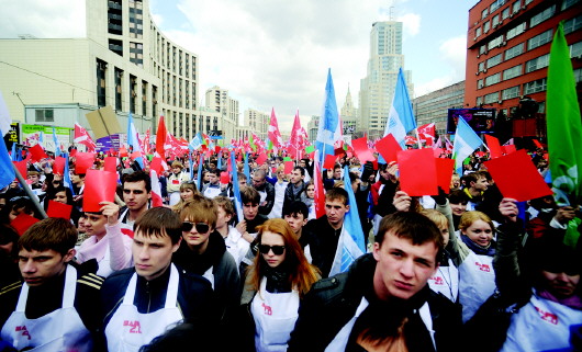 俄罗斯莫斯科亲克里姆林宫青年组织“纳什”的成员系着白围裙参加反腐示威。 CFP供图