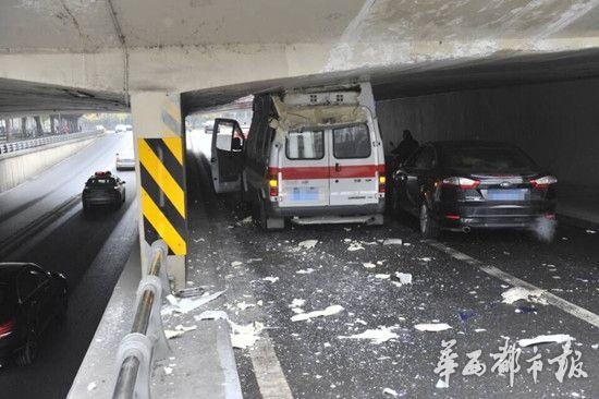成都一救护车过桥遭削顶 轮子放气仍出不来