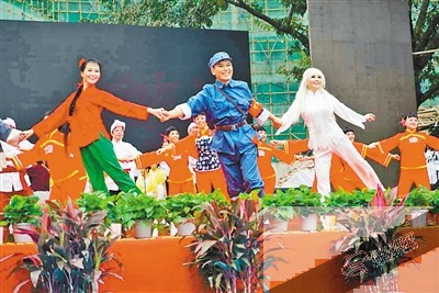 刘晓琳点开手机里面校庆那天他们轰动演出的谢幕剧照给我看:“我们全部踮了尖尖脚的哟,只是遭台口这些花盆挡住了,看不见。”照片上,身穿崭新的八路军军装,背着盒子炮的英俊男一号王大春一拖二:右手拉着红衣绿裤的喜儿,左手拉着衣衫褴褛的白毛女。刘晓琳跳的喜儿,而她的老同学,现已退休的重庆晨报资深编辑王建强,跳的大春。