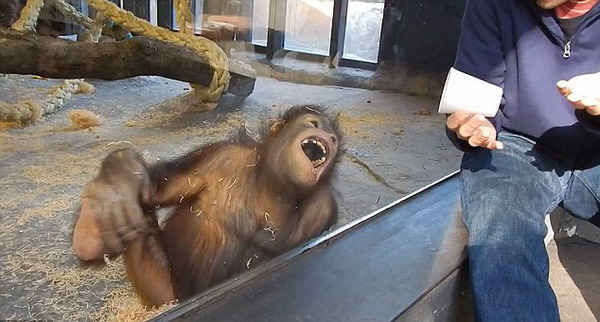国际在线专稿:据英国《每日邮报》12月9日报道,西班牙巴塞罗那一处动物园里的大猩猩在看完简单的魔术表演后,笑得前仰后合。