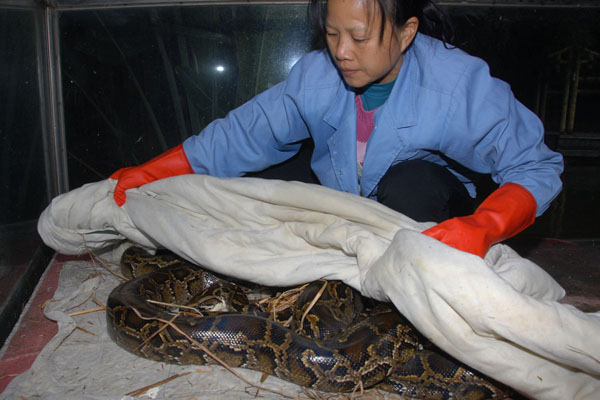 天气冷了,深圳野生动物园的饲养员为蟒蛇盖上棉被保暖;