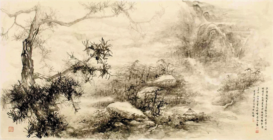 画展上还有两幅作品是两位画家合作完成的。由何洵瑶先画上近景,孔繁乐在此基础上添墨和补充远景。岭南画派的大胆用色加上传统国画擅长的辽阔布局。“传统和现代可以融合甚至互补。因为现代的东西讲究形式,传统的东西注重神似。形神互补反而更加漂亮”。孔繁乐这样评价。