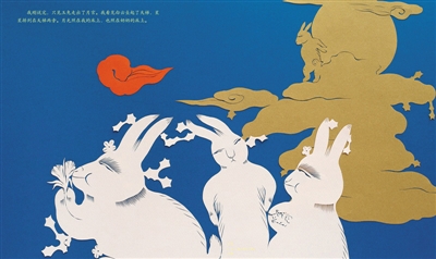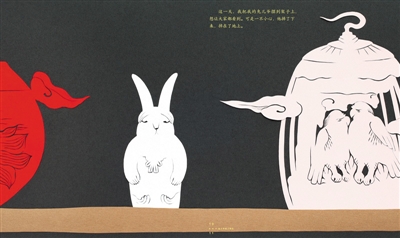 把剪纸应用于插画是我很久的一个理想,因为我是学书籍插画的。接了金波老师《兔儿爷丢了耳朵》很兴奋,因为兔儿爷的形象我很喜欢。我从小在农村长大,乡村里面跟动物接触特别多,小兔、小狗、鸭子、小猪,我对动物有特殊的偏爱,你看我的剪纸的作品就能知道,动物一直是我很重要的题材,也是对生命的礼赞。我特别喜爱小兔,前几年我剪了大量的兔子,我把小兔子当成小孩来看,有的在笑,有的在跳,有的在唱歌,每一个兔子不一样,这就有童趣了。我剪的其实比这多得多,因为有的画面出现了很多次修改。剪纸语言和其他艺术不同之处是,剪纸做“减法”,剪掉就没有了,最多剪了六七次,当然最后的结果是很高兴的。清华大学美术学院请我用新剪纸的艺术做儿童动画,包括这本《兔儿爷丢了耳朵》,剪纸成为其他文化产品的道路正在这些探索中慢慢呈现。