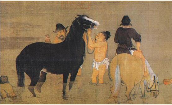 先科普一下“浴马图”,这幅收藏在北京故宫博物院的佳作,也算得上中国国宝级的藏画,它出自元代名家赵孟頫之手。画中描绘了盛唐时期马倌在溪水边给马匹沐浴的场景,溪水一湾,梧桐垂柳,绿荫成趣,骏马数匹,描绘得及其生动自然相映成趣。而这“浴马图”中马倌们穿着的正是《史记司马相如列传》中的神物——犊鼻裈(kun,1声)。
