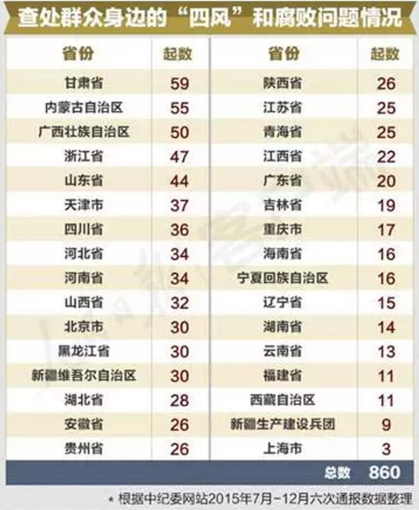 通过梳理,我们发现在“上榜”的860起案例中,甘肃、内蒙古、广西位列前三,新疆生产建设兵团和上海通报数则较少,分别为9起和3起。张明琦、洪厚鹏,连修厕所的钱都截留,难怪有群众疾呼每天“苍蝇”扑面,如果不把这些“苍蝇”彻底拍掉,他们迟早有一天会“长大成虎”。