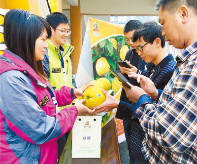 消费者在扫描梁平柚上的二维码查看相关种植信息。