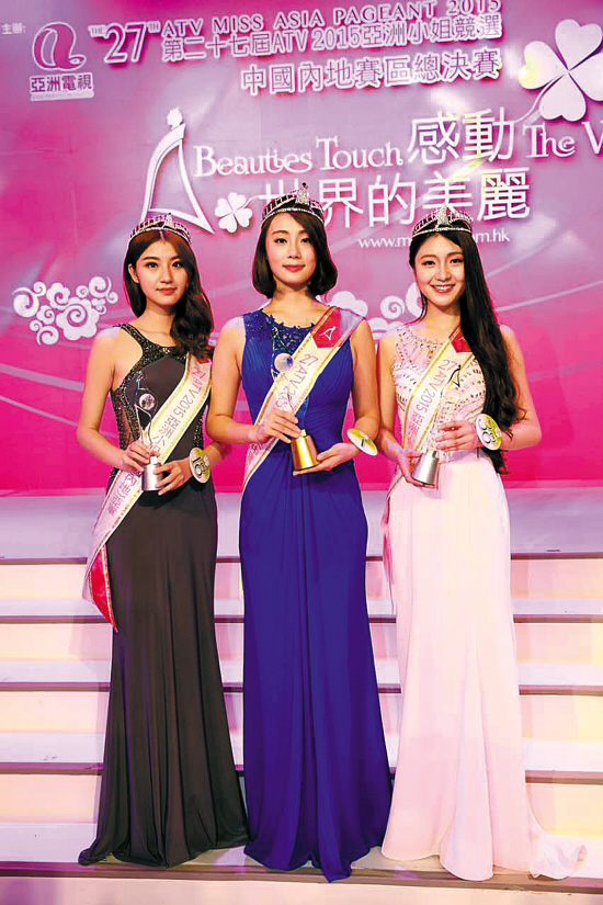 2015亚洲小姐中国内地总决赛三甲:(左起)亚军唐君娆、冠军邹昕美、季军樊玥