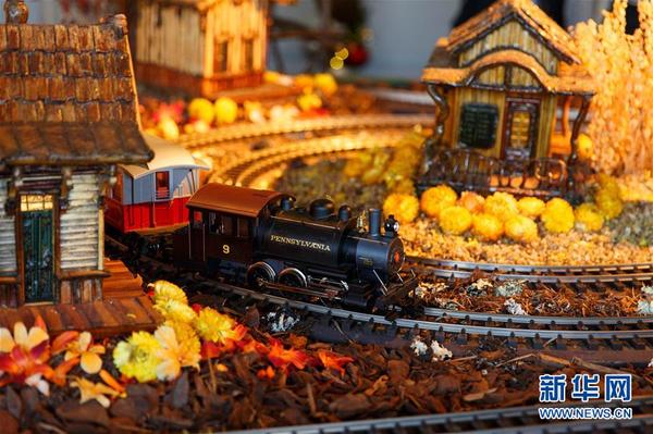 这是12月13日在美国纽约植物园拍摄的2015年节日小火车展。纽约植物园的节日小火车展是纽约圣诞节的传统活动之一。今年节日火车展的面积达3000平方英尺,整体规模超过以往,园林艺人用各种植物花叶,精心编制了150多个纽约经典地标模型。新华社记者李木子摄