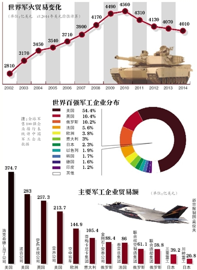 报告以2014年全球军售100强企业为统计对象,显示军售总额为4010亿美元,同比下降1.5%,其中美国和西欧军工企业约占80%的市场份额。