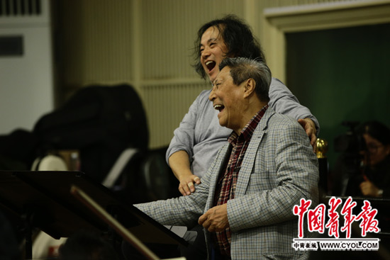 12月10日,中国国家交响乐团《抗日战争安魂曲》交响乐排练现场,王西麟与指挥汤沐海交流心得。