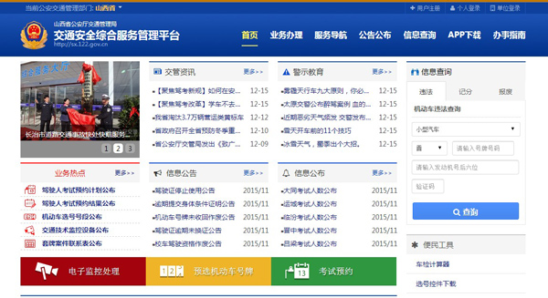 人民网太原12月15日电(王建) 15日上午,从山西省公安厅交管局召开的新闻发布会上获悉,从今天起,山西公安交警“互联网交通安全综合服务管理平台”将全面正式上线。这意味着今后全省700万驾驶员和500多万机动车主足不出户就可以享受“互联网+交通管理创新”带来的便捷服务。全省公安交警“互联网交通安全综合服务管理平台”正式上线后,广大驾驶员和机动车车主只要通过互联网使用统一域名“sx.122.gov.cn”登陆平台,通过网站简单注册就可以享受公安交管部门提供的交管动态、安全宣传、警示教育以及交通管理信息查询
