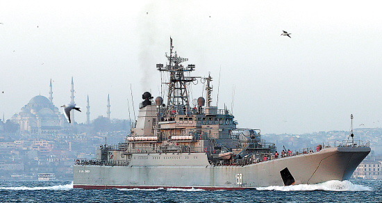 14日,土耳其伊斯坦布尔,俄罗斯“凯撒-库尼科夫”号大型登陆舰驶过博斯普鲁斯海峡的萨拉基里奥角 IC供图