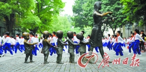 广州沙面公园,小学生在排队出操。