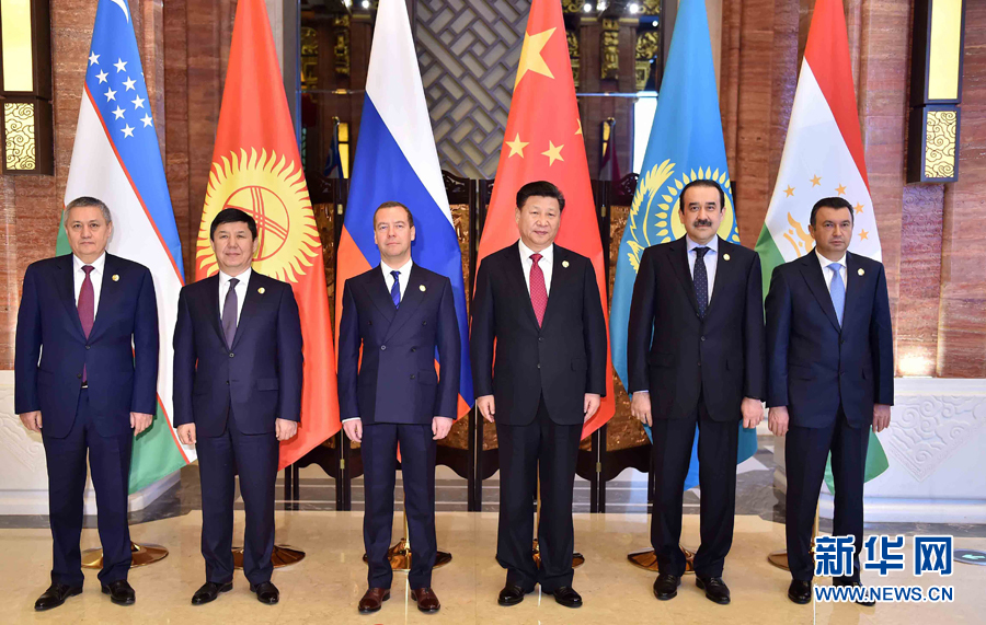 12月16日,国家主席习近平在浙江省乌镇集体会见上海合作组织成员国领导人哈萨克斯坦总理马西莫夫、吉尔吉斯斯坦总理萨里耶夫、俄罗斯总理梅德韦杰夫、塔吉克斯坦总理拉苏尔佐达、乌兹别克斯坦第一副总理阿齐莫夫。新华社记者李涛摄