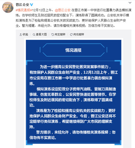 网传晋江一中发生暴力袭击事件 警察通报系模拟演练